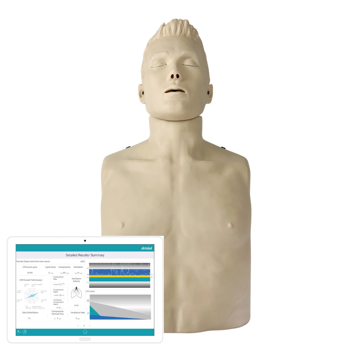 Amoul Man AM7-H – pažangus CPR mokymų manekenas su išmaniuoju grįžtamuoju ryšiu.Skirtas profesionaliam gaivinimo mokymui pagal AHA ir ERC gaires. Šis manekenas leidžia tiksliai įvertinti kompresijų gylį, greitį ir ventiliacijos efektyvumą realiu laiku. Integruoti LED indikatoriai, garsinis signalas ir ilgaamžė konstrukcija užtikrina efektyvią ir patikimą mokymosi patirtį.